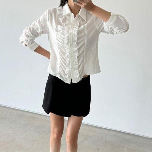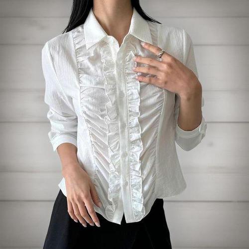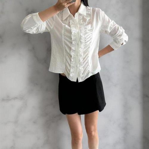 [신상오픈런]여성 가을 하객 패션 프릴 셔링 슬림 크롭 긴팔 블라우스