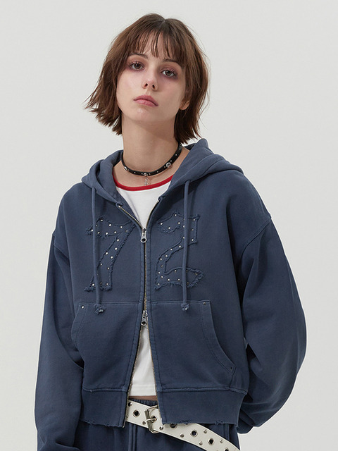 [키르시] 빈티지 워싱 스터드 포인트 크롭 후드 집업 [네이비]