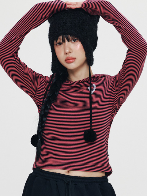 [키르시] 키르시 X 피투 스트라이프 슬림핏 후디드 롱슬리브 [다크 핑크]
