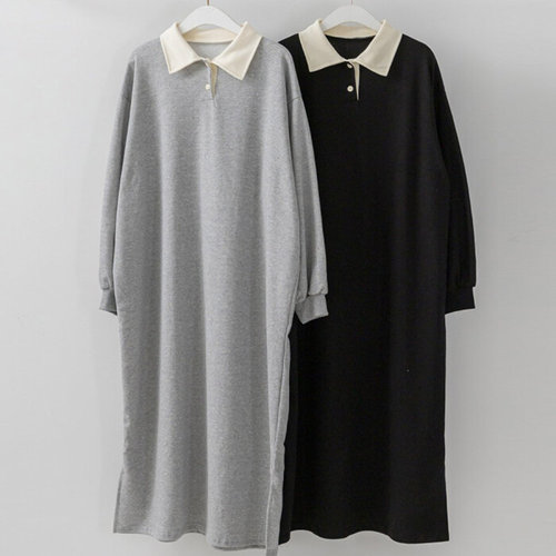 부드럽고 베이직한 소재로 편안하게 착용 가능 카라 배색 포인트 단추 임산부 원피스 미디 패션