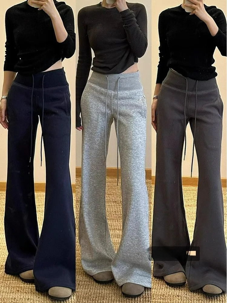 하이웨이스트 와이드 레그 스트레이트 컷 바지 여성용 겨울 스포츠 캐주얼 드로스트링 루즈 슬리밍 팬츠 패셔너블 벨 바텀