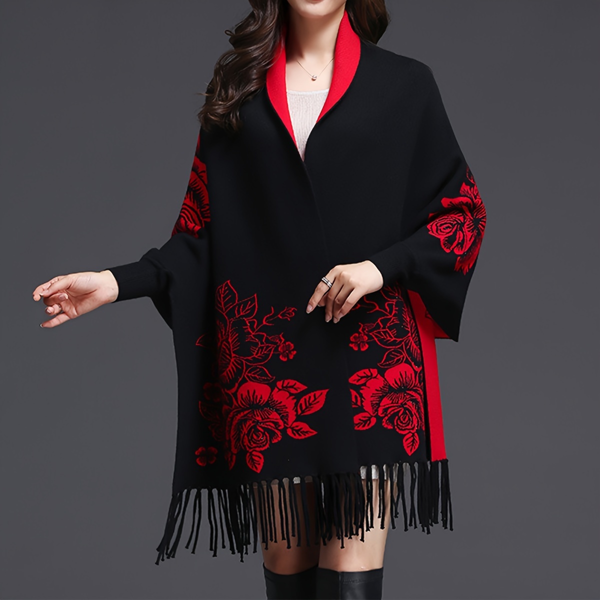 TEMU 우아한 자카드 폴리에스테르 스카프 숄, 주말 캐주얼 두꺼운 따뜻한 케이프 스타일 랩, 술 장식, 방풍, 깃털 없음, 가을 및 겨울용