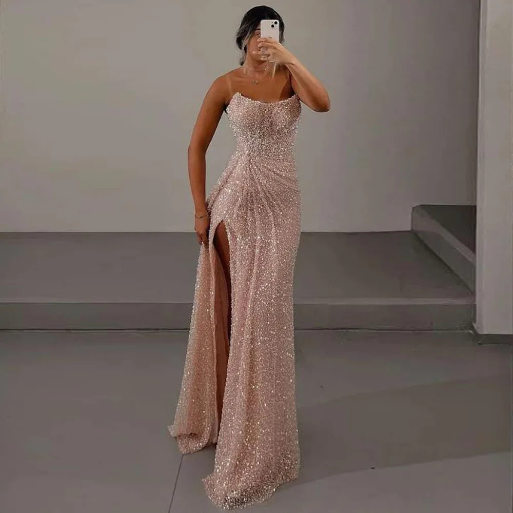 맞춤형 글래머러스 라이트 핑크 스팽글 Strapless 민소매 긴 댄스 파티 드레스와 스플릿 글리터 인어 공식 칵테일 드레스