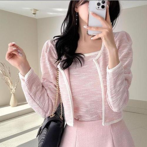 [옷자락]여자 클래식 트위드 민소매티 크롭 가디건 세트
