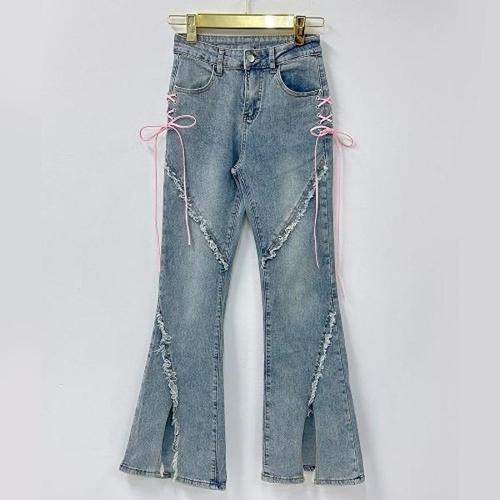 [엄지척]핑크 리본 스트링 트임 부츠컷 청바지 연청 데님 바지_20022657_667501