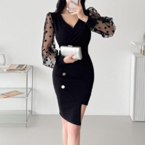 [다잇템]여성 랩형 문양 메시 땡땡이 쁘띠 V넥 드레스