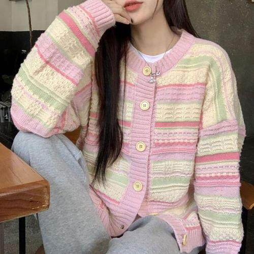 [셀러허브_여성트랜드패션]ONM 라운드넥 스트라이프 배색 파스텔 긴팔가디건