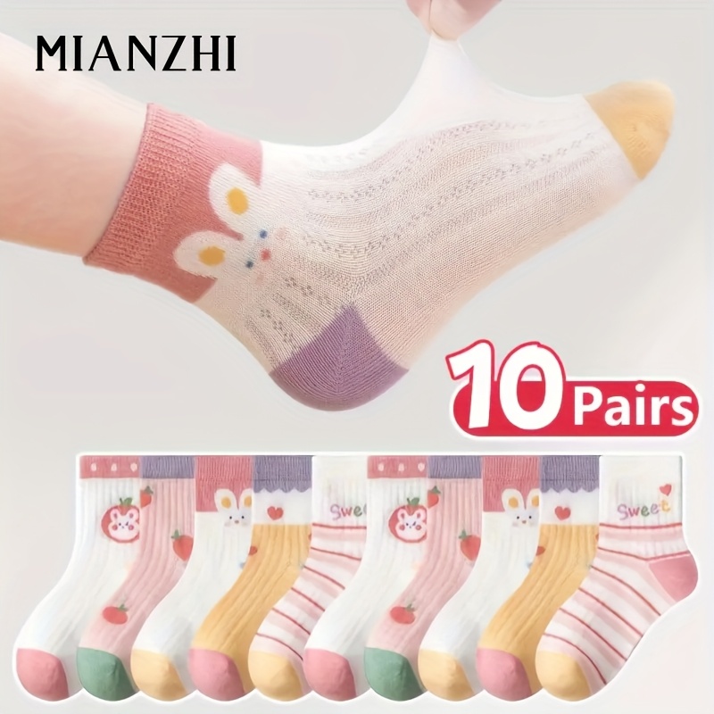 TEMU 10쌍 여아용 통기성 메쉬 발목 양말 - 귀여운 토끼 & 딸기 디자인, 가벼운 소프트 양말, 학교, 데이트, 캐주얼 착용용 - 내구성 있는 어린이 파티 의류, 장난스러운 아이들 신발, 편안한 양말, 야외 활동에 완벽