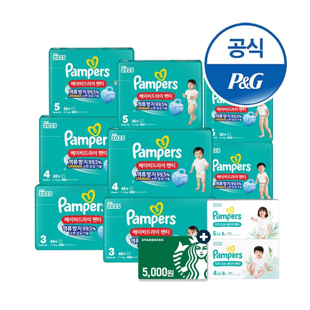 베이비드라이팬티 기저귀 5단계 36매x8팩(2박스)+스타벅스 5천원+체험팩 2팩 증정