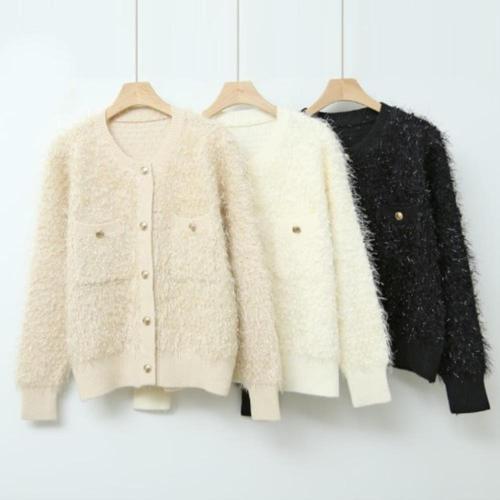 [다잇템]여성용 카디건 금빛버튼 퍼 카라없는 오피스룩
