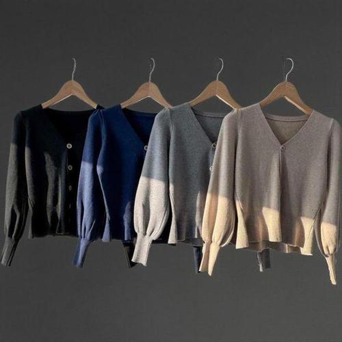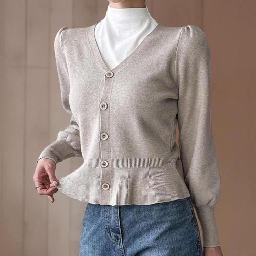 [신상오픈런]여성 여리핏 브이넥 프릴 퍼프 가을 하객룩 울 니트 가디건