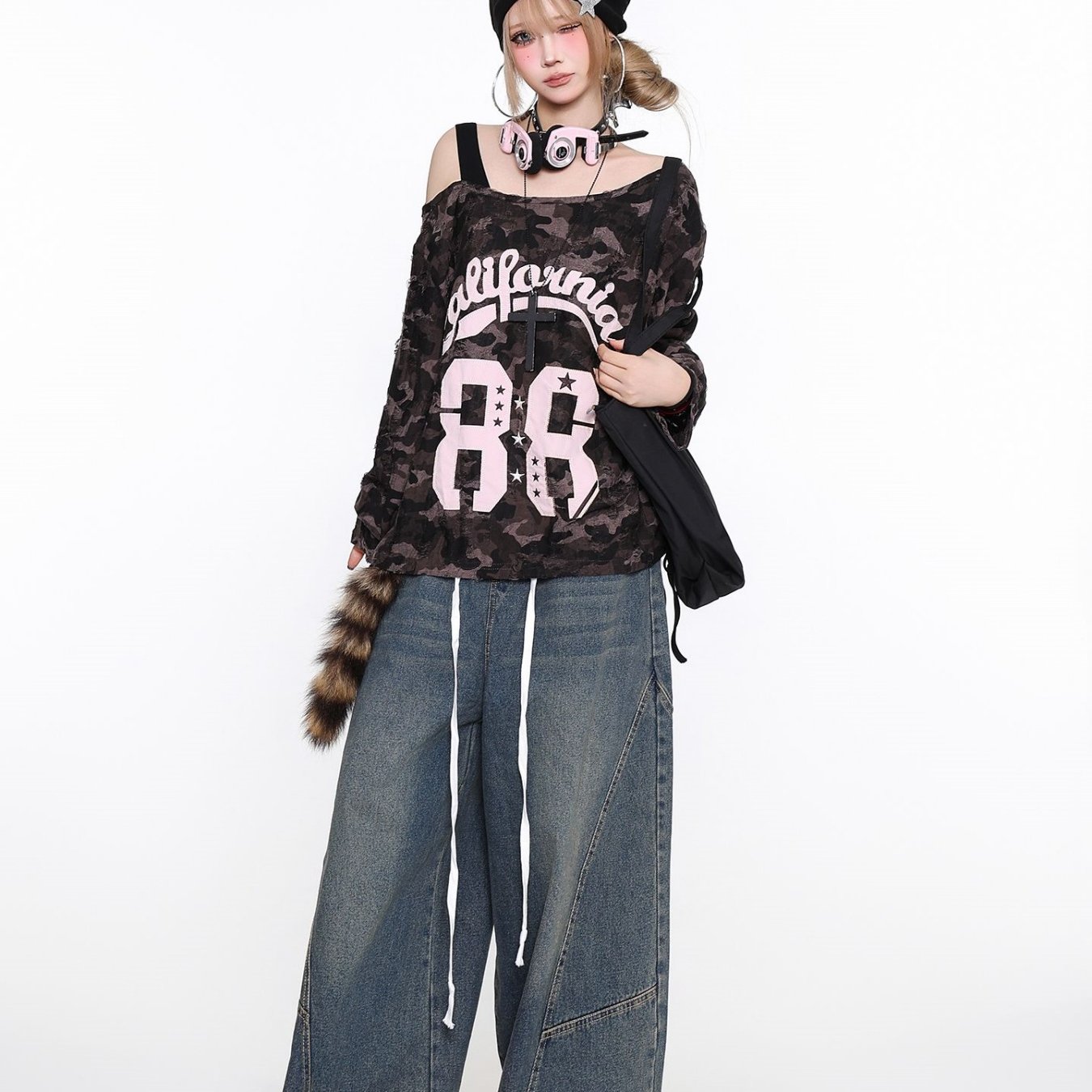 TEMU 레트로 레터 대각선 어깨 카모플라주 블라우스 긴팔 티셔츠 여성용 디자인 루즈 찢어진 오프숄더 탑