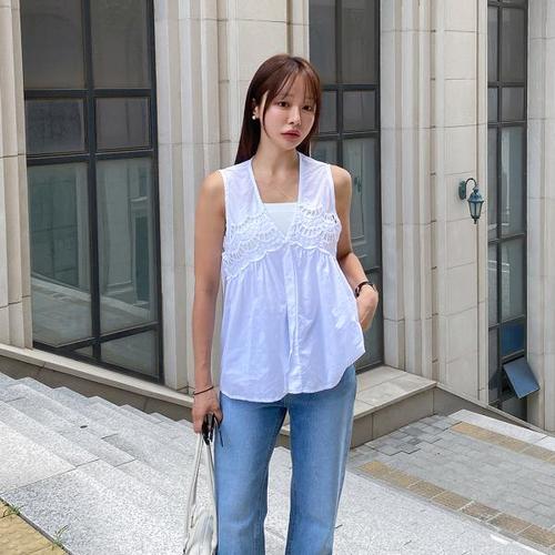 [리엘라]퍼니스 브이넥 펀칭 셔링 단추 민소매 블라우스
