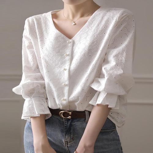 [다잇템_패션]여성 레이스 펀칭 롱슬리브 흰색 V넥 블라우스