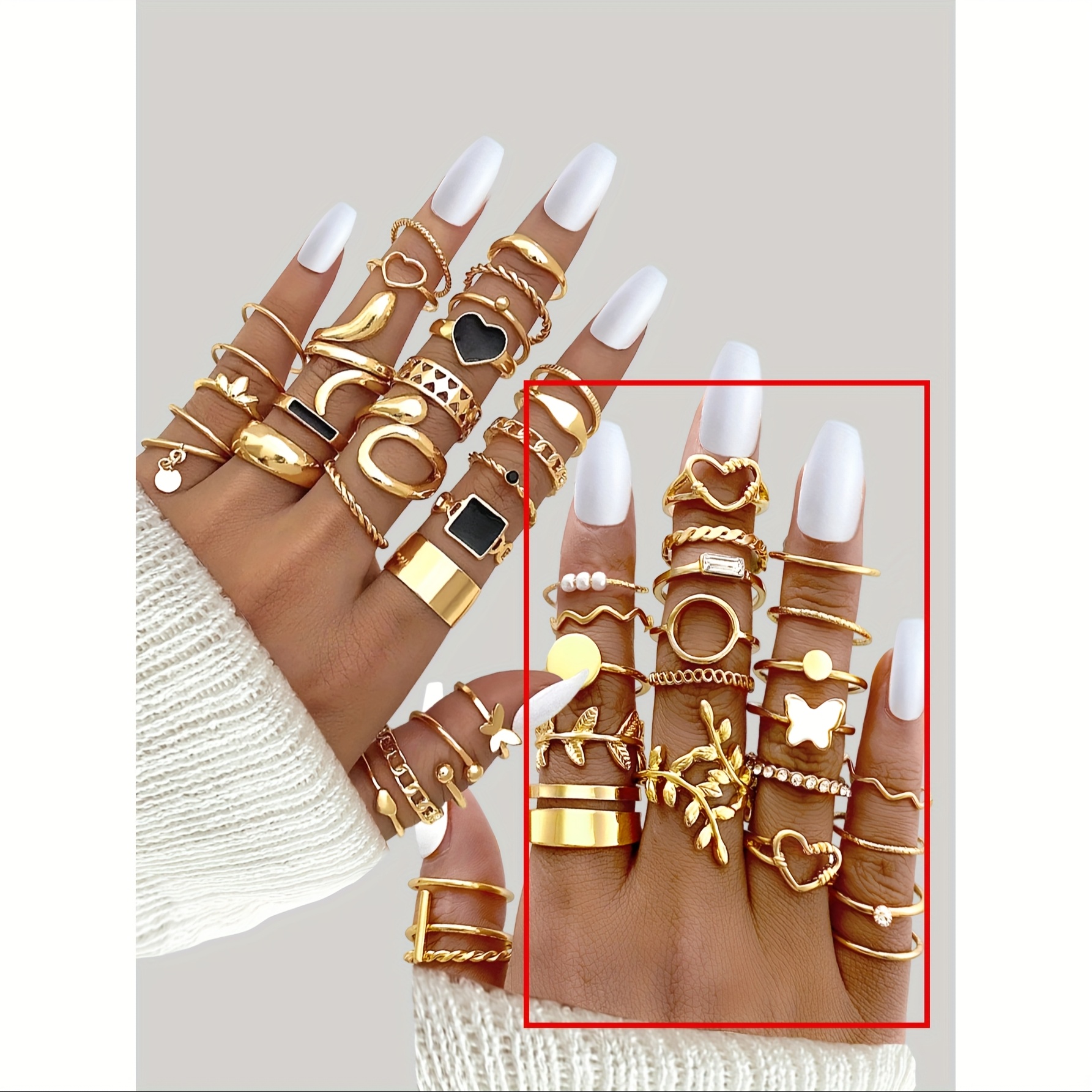 TEMU 51개/24개 세트 패션 트렌디 멜란지 컬러 여성 반지 세트, 블랙 스퀘어 & 하트 디자인 - 일상 착용, 휴가 파티, 가족 친구 선물용 골든 레이디스 링 컬렉션