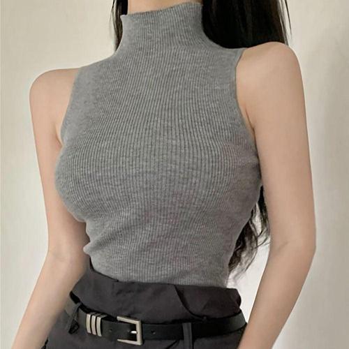 [에이치플러스몰]하이넥 슬림 골지 크롭 나시 여성 여름 민소매티