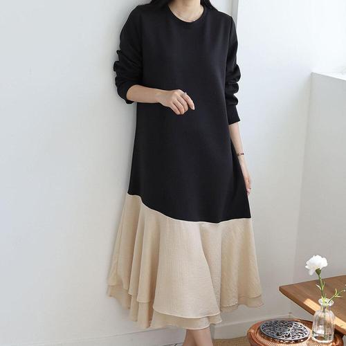 (브랜드 추천) 150kg까지 빅사이즈 여성 프릴 볼륨 주름 a라인 롱 맨투맨 원피스 가을 겨울 편한 얇은것 기모 도톰 따뜻한 박스 날씬해보이는 모던 패치워크 찰랑 이쁜 원피스