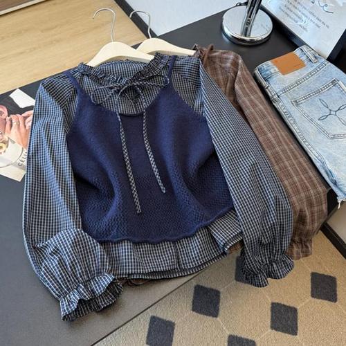 [걸코어/러블리] 체체토 체크 리본 프릴 나시 뷔스티에 블라우스 (2color)