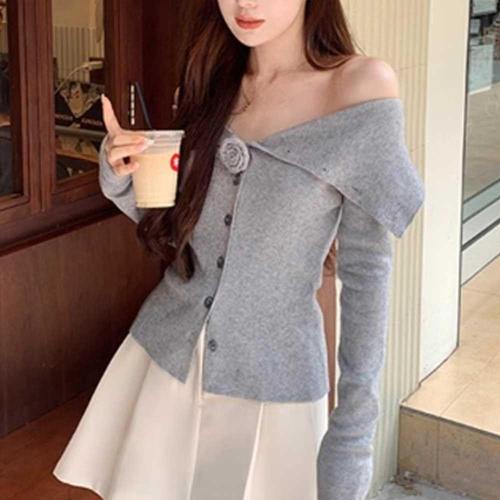 소개팅 룩 모임 플라워 코사지 오프숄더 버튼 가디건 WFL0IG8