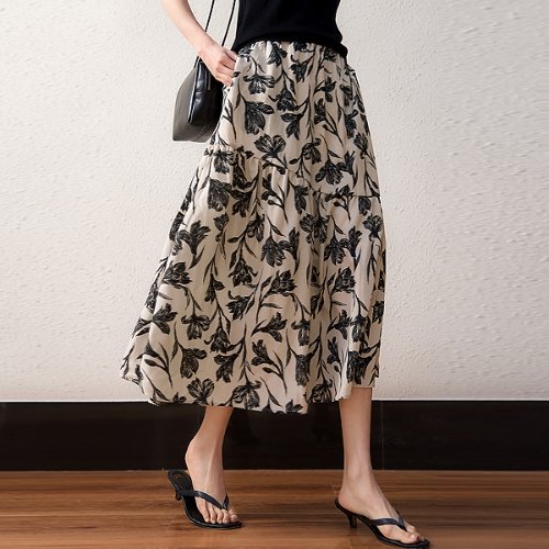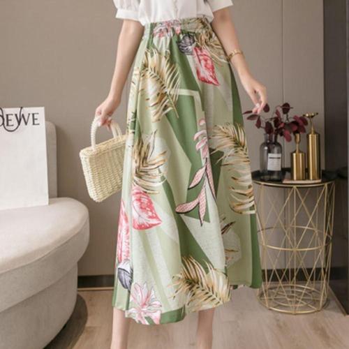 [옷자락]여성용 데일리 플라워 패턴 A라인 롱 스커트 허리끈 포함