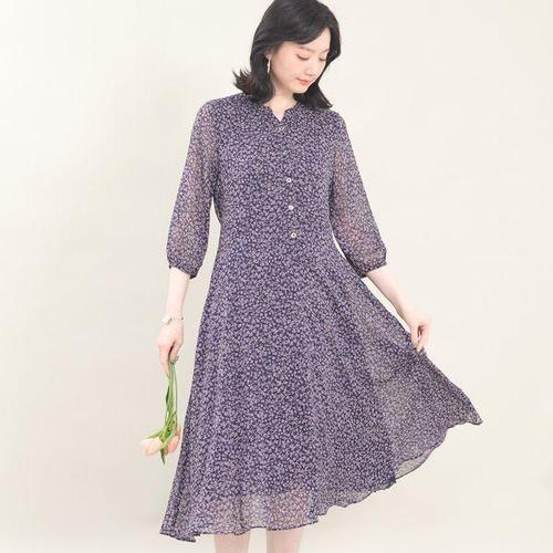 [애비뉴투지]엄마옷 쉬폰 플라워 라운드 트임 단추 허리끈 A라인 마담 여성 여름 칠부 롱 원피스 K05410