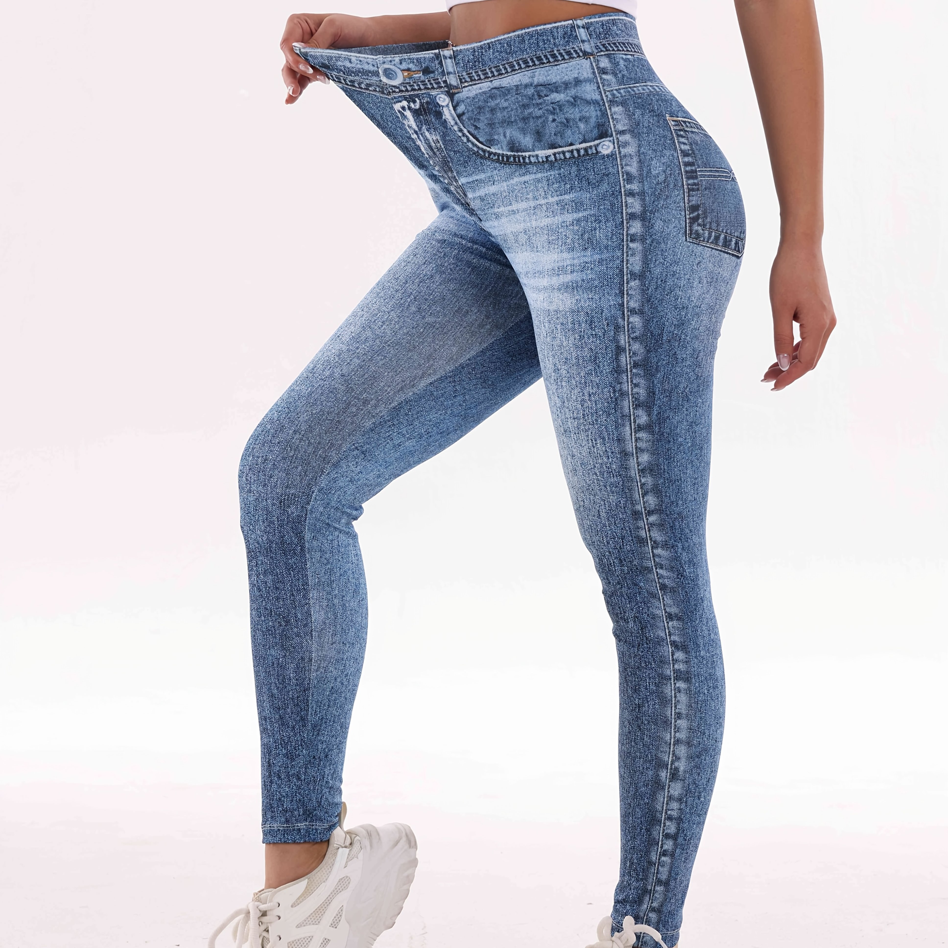 TEMU 모조 데님 프린트 하이웨이스트 운동용 레깅스, 캐주얼 타이트핏 탄력 레깅스, 사계절 편안한 착용감