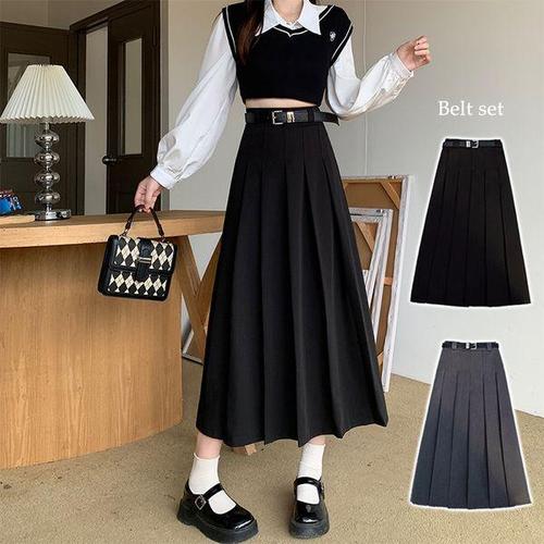 [에어플레인]A라인 플리츠 벨트 롱 스커트(2color)
