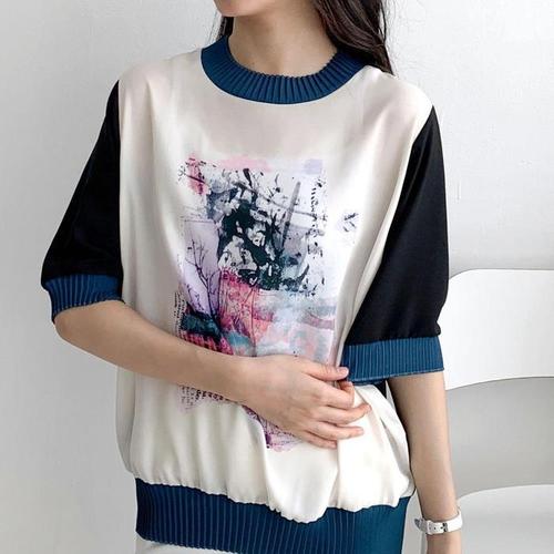 여성 프린팅 배색 플리츠 반팔티 블라우스