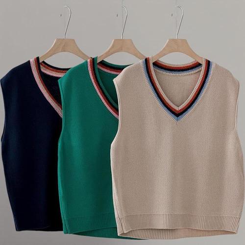 POMTOR 여성 춘추 니트 조끼 패치워크 트렌디