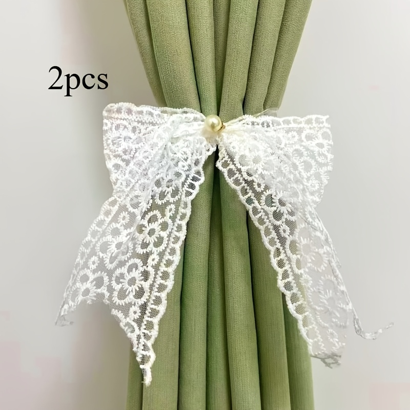TEMU 2pcs 우아한 프랑스 스타일 진주 실 커튼 타이백 - 클래식 화이트 꽃 디자인, 녹색 잎이 있는 라이트 럭셔리 폴리에스테르 리본 홀드백, 홈 데코용