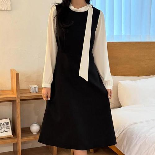 [애비뉴투지]엄마옷 드랍 스카프 타이 하이넥 벨소매 긴팔 여성 봄 가을 초겨울 정장 롱 원피스 K01408