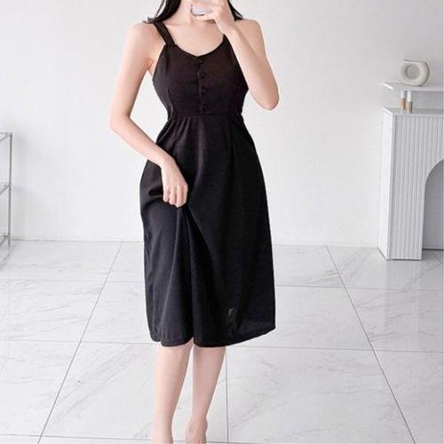 [옷자락] 여성 블랙 하트넥 어깨끈 플레어 롱 나시 드레스