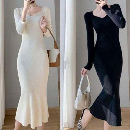[모노무드]모노무드 홀복 여성 하트넥 브이넥 슬림핏 니트 롱원피스