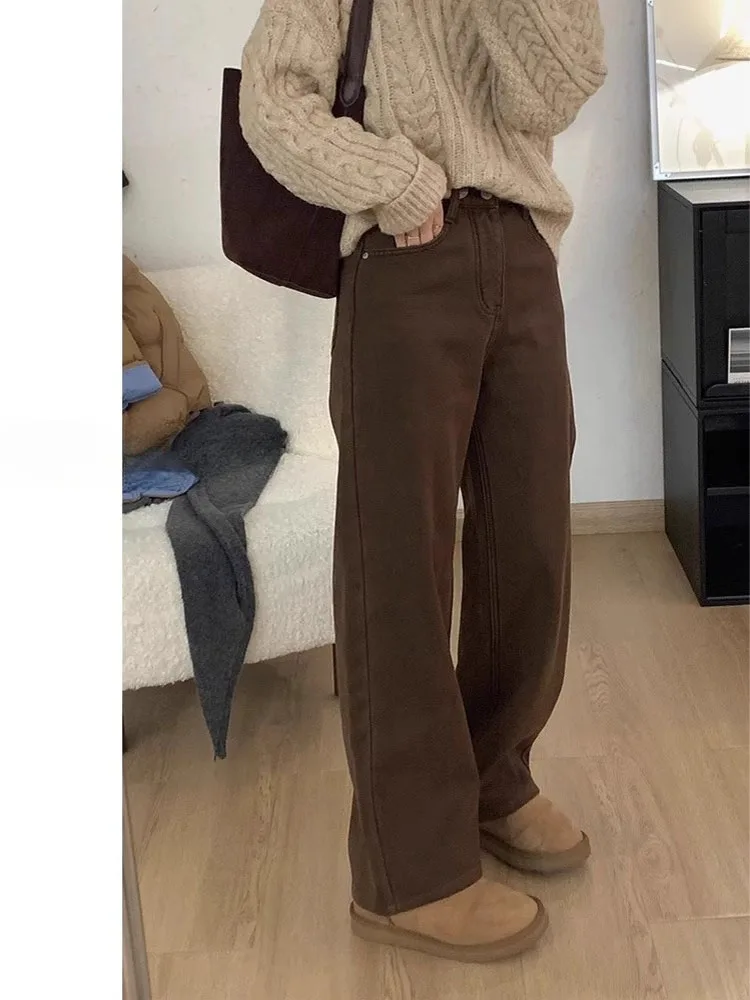 하이웨이스트 와이드 레그 슬림핏 커피색 데님 팬츠 여성용 가을 신상 레트로 루즈핏 스트레이트 튜브 트라우저