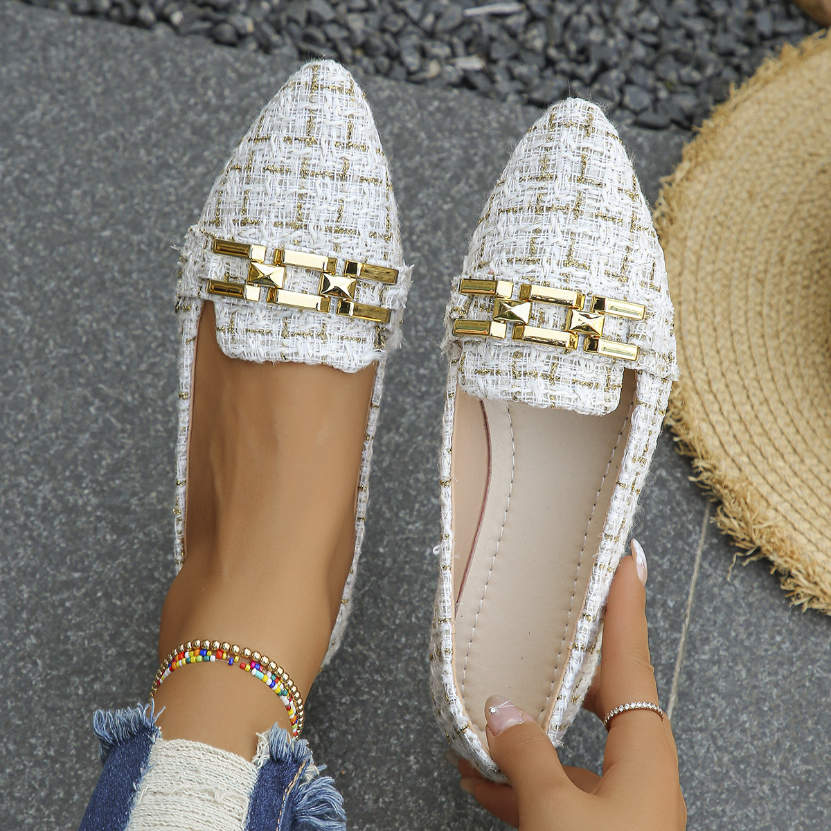 TEMU 여성용 경량 슬립온 로퍼 - 부드러운 패브릭 갑피와 골든 버클 스트랩, 뾰족한 발끝, 캐주얼 및 정장용 편안한 고무 밑창, 화이트, 여성 신발