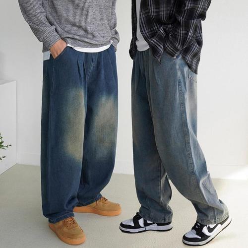 [쿼터]남자 빈티지 워싱 핀턱 항아리 벌룬 배기 와이드 밴딩 데님 팬츠