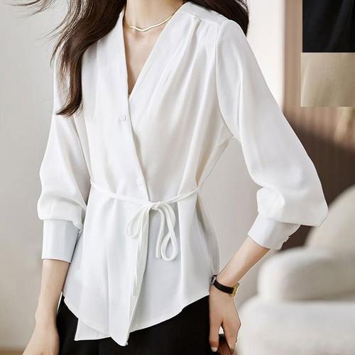 [XBJ93181]브이넥 블라우스 어깨 셔링 허리 스트링 슬림