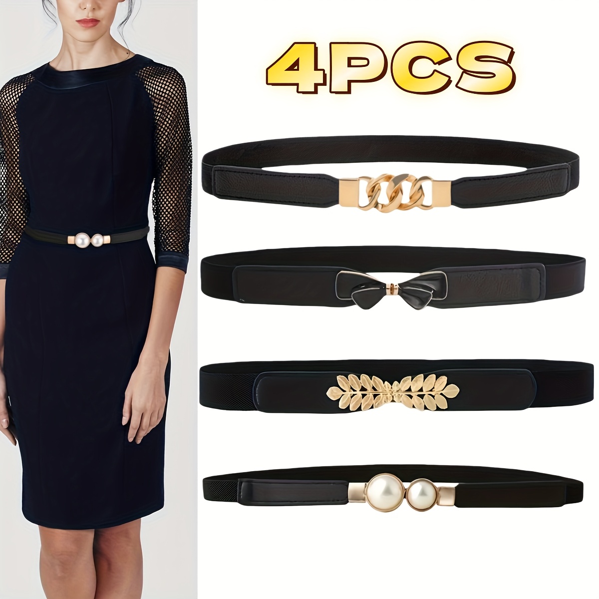 TEMU 4개 여성용 탄성 허리 밴드 - 신축성 있는 미끄럼 방지 벨트, 골드 톤 버클 클로저, 우아한 드레스, 바지, 포멀 & 캐주얼 의상 - 파티, 일상복에 편리한 착용/탈착 벨트 - 여성에게 완벽한 선물 (할로윈, 크리스마스, 결혼식)
