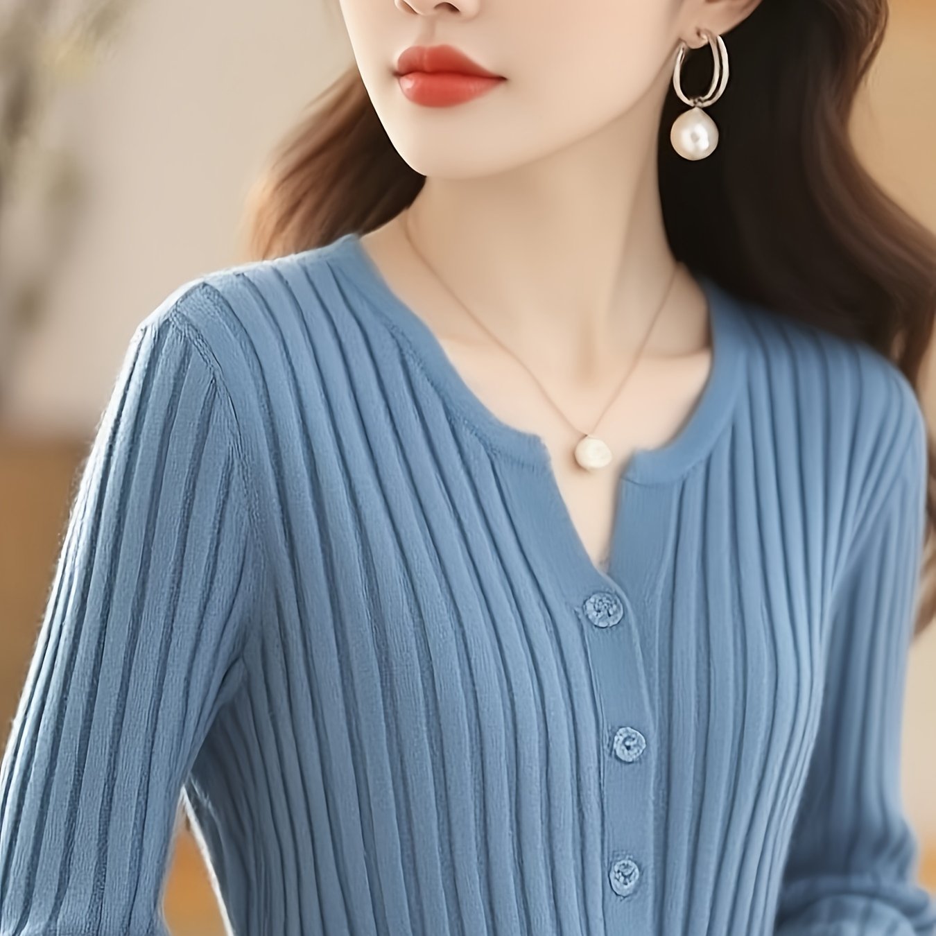 TEMU 여성용 슬림핏 V넥 가디건 - 긴팔 버튼업 스웨터, 솔리드 컬러, 봄/여름/가을에 완벽한 레이어링 아이템, 리브 텍스처, 다용도 아우터웨어 | V넥 스웨터 | 건축적 디자인