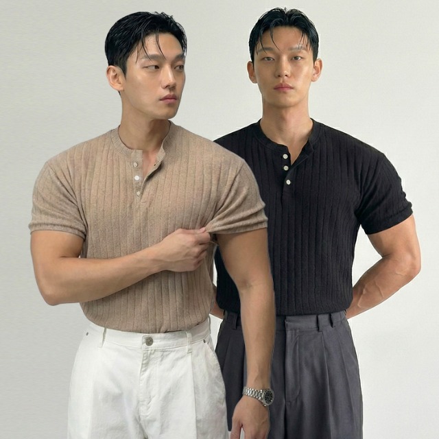 [주문폭주] 세미 머슬 더블 레이어드 버튼 헨리넥 카라 긴팔 니트 (5color)