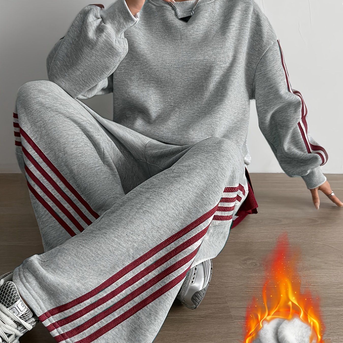 TEMU 여성용 컬러블록 플록 후드 스웨트수트 2피스 - 매치ング 조거 & 스웨터로 따뜻한 겨울, 기계 세탁 가능한 가을/겨울 의상 (2피스 세트), 라운지, 스트리트웨어 - 솔리드 컬러 베이스 & 디자인