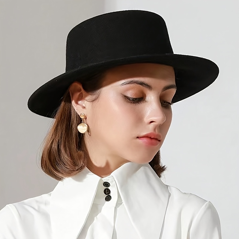 TEMU 2D 플랫 - 1pc 우아한 여성 플랫 탑 페도라 모자 - 블랙 영국 스타일 재즈 캡, 경량 및 통기성 폴리에스테르, 공연 및 일상 착용에 완벽, 통기성 페도라 모자|영국 스타일 모자|경량 모자