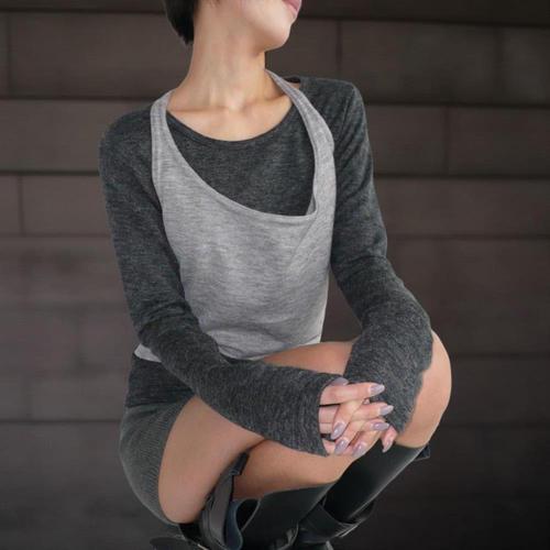 [에이치플러스몰]옆트임 홀터넥 슬림 롱나시 여성 바디핏 레이어드룩