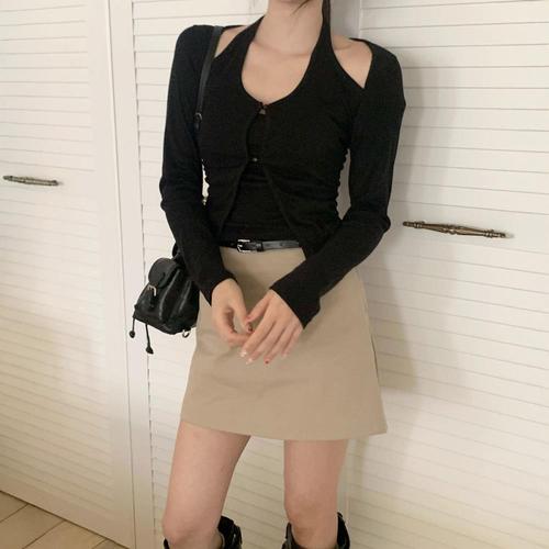 [옷자락] 여자 홀터넥 어깨트임 슬림핏 긴팔 티셔츠 상의