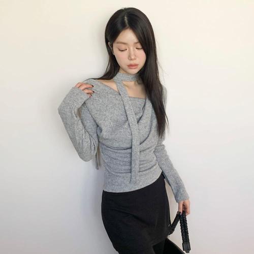 [탱커스]홀터넥 숄더 트임 랩 스타일 긴팔 니트 (TX4KP020L0)