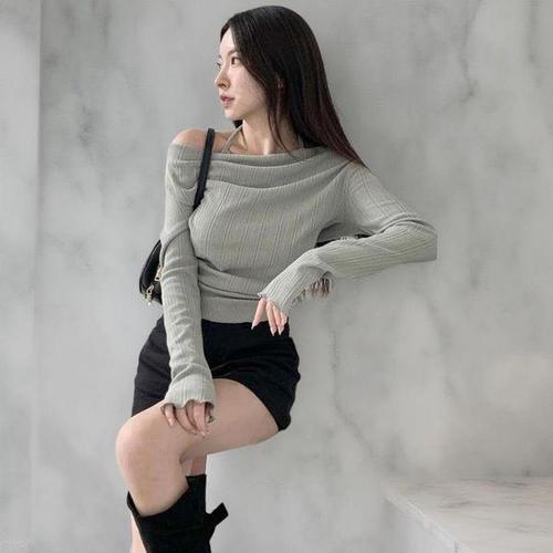 [옷자락] 여자 힙무드 줄지 홀터넥 오프숄더 긴팔 니트