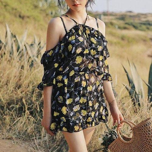 [신상오픈런]여성용 여름 꽃무늬 홀터넥 신축성 원피스 수영복