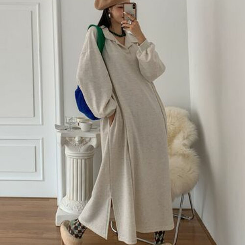 에르디테 / 곰돌이 레터링 카라 빅사이즈 옆트임 홈웨어 롱원피스