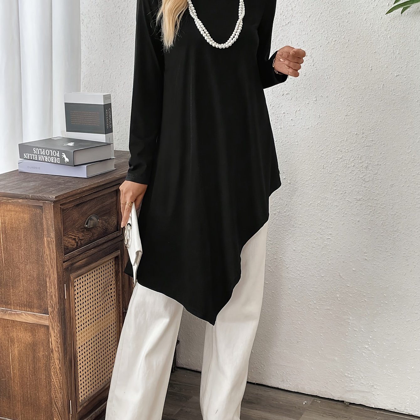 TEMU 여성용 캐주얼 롱 슬리브 투닉 탑 - 비대칭 밑단, 라운드 넥, 루즈핏, 솔리드 블랙, 봄 & 가을에 완벽, 집이나 일상 외출용, 캐주얼 웨어|비대칭 밑단|편안한 핏, 여성용 플러스 사이즈, 비대칭 대형 사이즈, 우아한 여성용 탑, 여성용 긴 탑, 커티용 여성용 탑