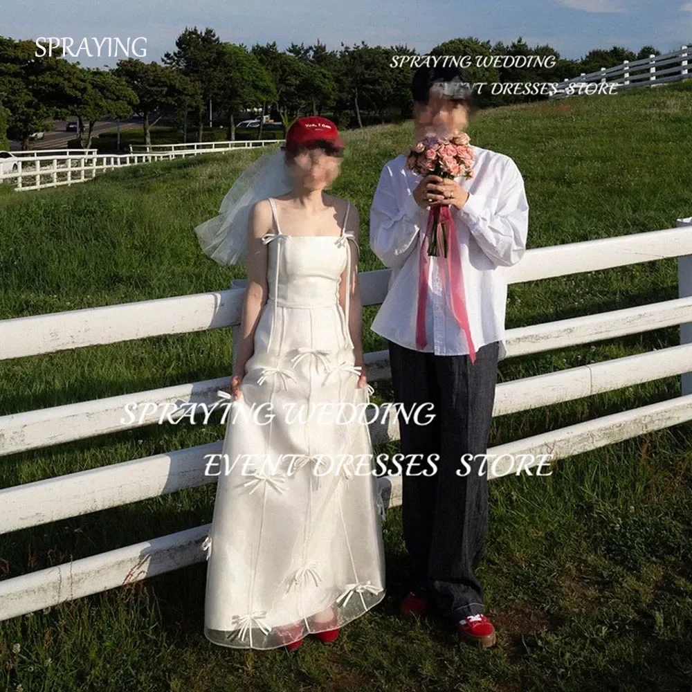 스프레이 간단한 스파게티 스트랩 새틴 웨딩 드레스 Photoshoot 긴 활 신부 가운 한국 정원 웨딩 가운 코르셋 사용자 정의